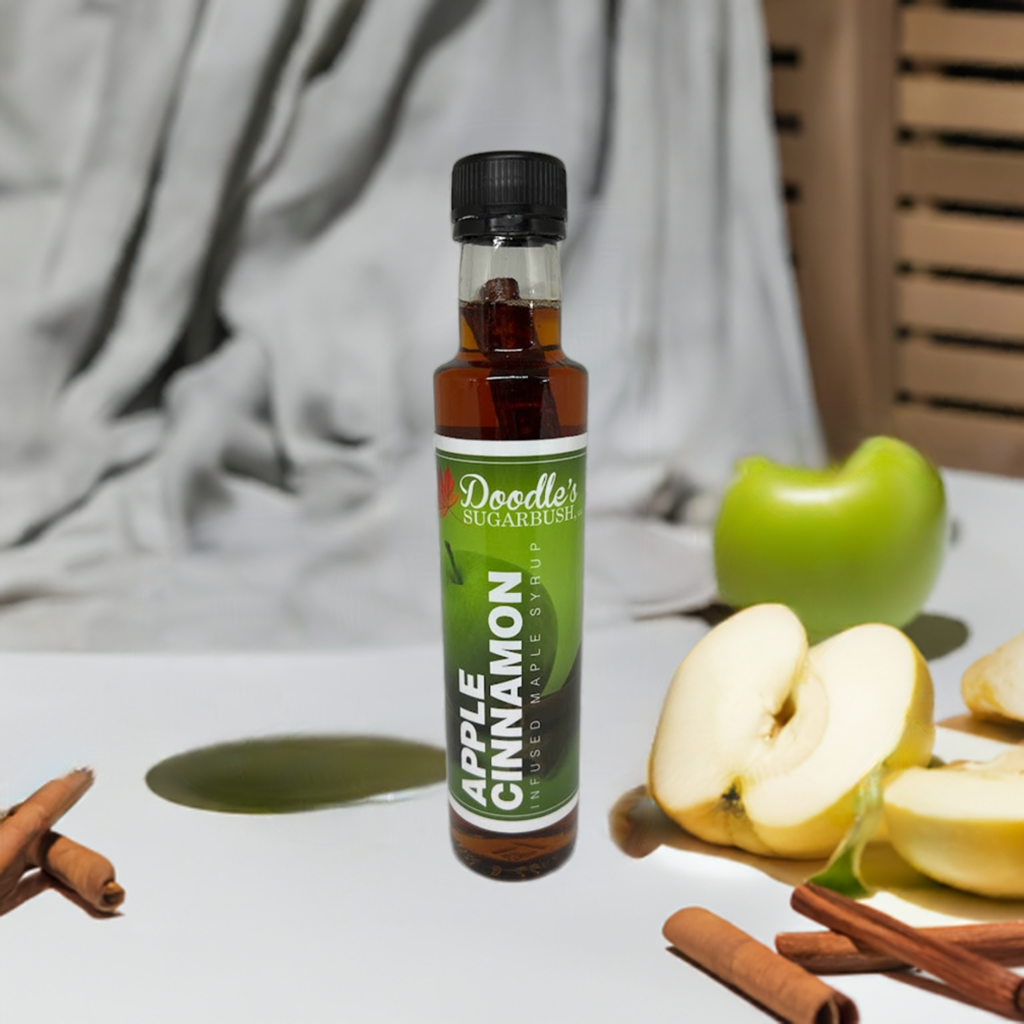 Indulge in the perfect blend of nature's sweetness with our Apple Cinnamon-Infused Maple Syrup. This premium syrup starts with the finest 100% pure maple syrup, carefully infused with the warm, comforting flavors of crisp apples and aromatic cinnamon. The result is a rich, velvety-smooth syrup that brings a deliciously unique twist to your favorite breakfast treats.